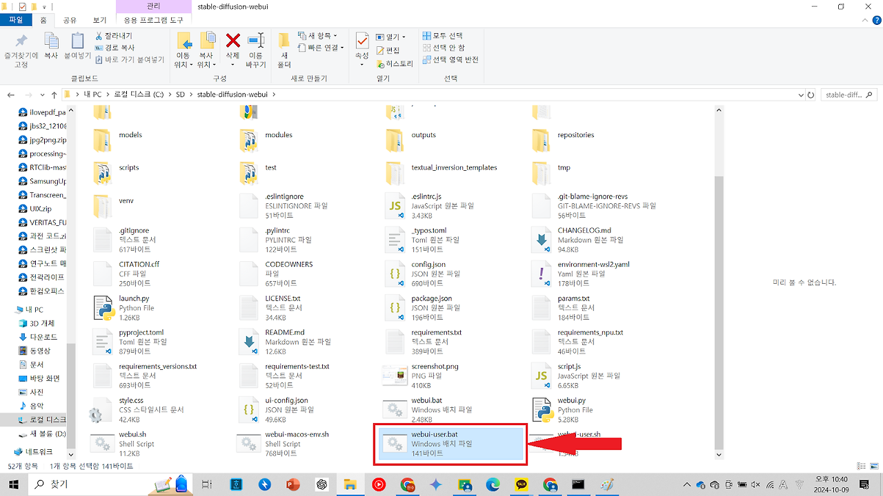 stable diffusion이 설치된 폴더에서 webui.bat을 실행하면 실행에 필요한 파일들을 자동으로 설치한다. ( 기숙사 WIFI 기준10분 ~ 20분정도 소요 )