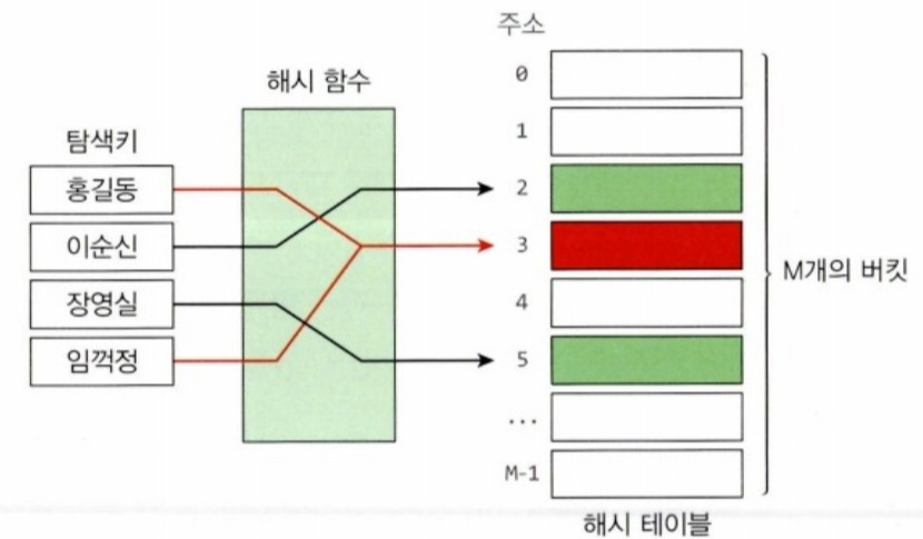 버킷이 충분하지 않으면 경우에 따라 서로 다른 키가 해시함수에 의해 같은 주소로 계산되는 상황이 발생.